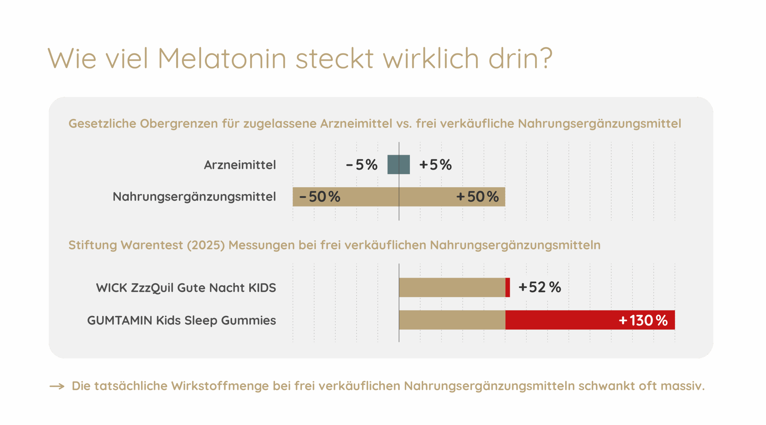 Wie greifbar das wird, zeigte auch Stiftung Warentest bei Kinderprodukten: Ein Präparat enthielt statt der angegebenen 0,5 mg ganze 1,15 mg Melatonin – das entspricht +130 %.⁹ Zum Vergleich: Bei Arzneimitteln sind Abweichungen von höchstens ± 5 % erlaubt³.