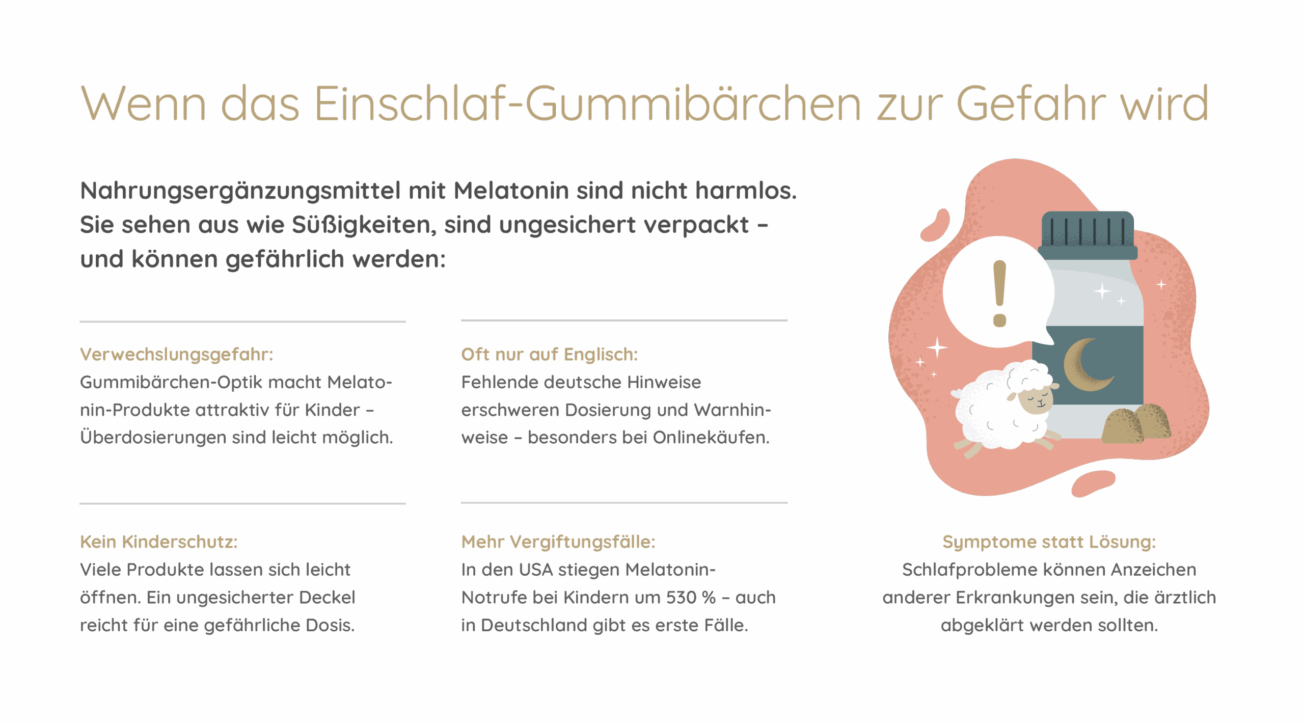 Erschwerend kommt hinzu: Bei mehreren Produkten fehlte ein kindersicherer Verschluss.⁹ In den USA stiegen die Fälle von Melatonin-Vergiftungen bei Kindern zwischen 2012 und 2021 um 530 % – betroffen waren vor allem Kinder unter fünf Jahren.⁷ Auch in Deutschland wurden bereits entsprechende Fälle gemeldet¹⁰. Die Zahlen zeigen deutlich: Diese Produkte sind nicht harmlos.